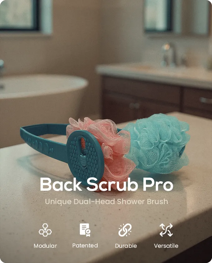 One day, I sat at my desk determined to find a solution. That's when the idea came to me: a double-sided brush, designed so that when you wash your front, your back gets washed at the same time. I also realized this design could help people wash their legs without bending down — making it practical, safe, and easy to use.